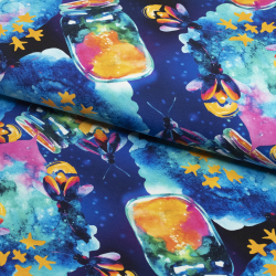 Bomuldsjersey med mellemstort print med ildfluer og syltetøjsglas i forskellige neonfarver på blå baggrund.