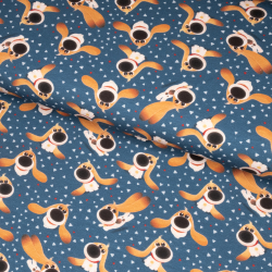 Bomuldsjersey med de mest nuttede hunde og små trekanter i forskellige farver på blå baggrund.